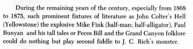 “This is the creature that dad wrote about; the” Bear Lake Monster.” It was first sighted by a Mormon colonizer, Joseph C. Rich, in the 19th century. Though he recanted his claim, many other legends and stories have come about from it; some have said that it’s a giant snake with legs that Pecos Bill wrestled with and threw to Loch Ness, where it in-turn became the “Loch Ness Monster,” while others claim that it is a plesiosaurian.”